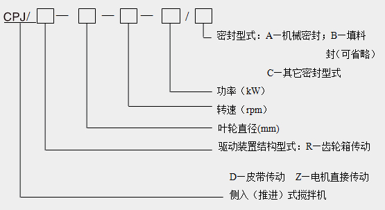 CJJ型号标记及示例: CJJ:侧入式搅拌机型号 T:轴封型式代号(填料密封注T,机械密封注M) S1:接液部位材料代号 |