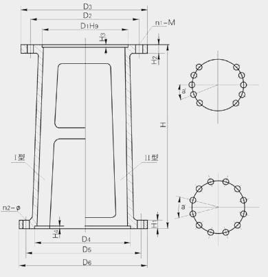 注:WJ型、DJ型、DXJ型-30A/B、35A、40B、45A四种机架底面为Ⅰ型和Ⅱ型(Ⅰ型不须标柱,Ⅱ型须在型号后面注Ⅱ、Ⅱ型a°=30°,n2-φ为12-14)其余机架为Ⅱ型(不须标注)