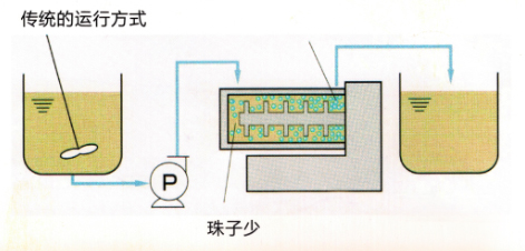传统磨机的运行方式 1、粒度难以控制,分散不充分; 2、粒度分布往往较宽; 3、无法控制物料的温度; 4、在大流量高速运转时,磨介易聚集在腔体一侧,容易堵塞在出料口。 |